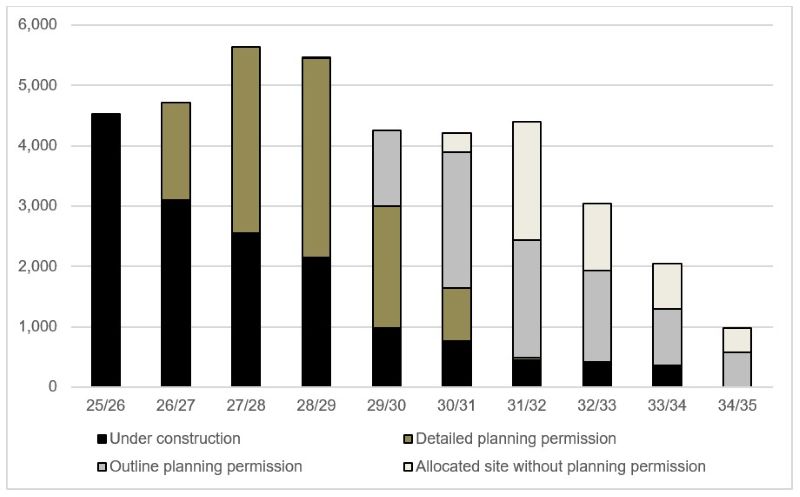 6.26. The 2025 SHLAA assesses 356 sites. Of these, 304 sites are considered to be suitable, available and achievable with a total capacity of 43,408 dwellings contributing 39,279 units to the identified supply from 1 April 2025 to 31 March 2035 with a further 4,129 units in the long-term. Table 1 and Figure 1 below shows a rolling trajectory of deliverable supply from available and achievable SHLAA sites (i.e. excludes windfall) that is updated on an annual basis.